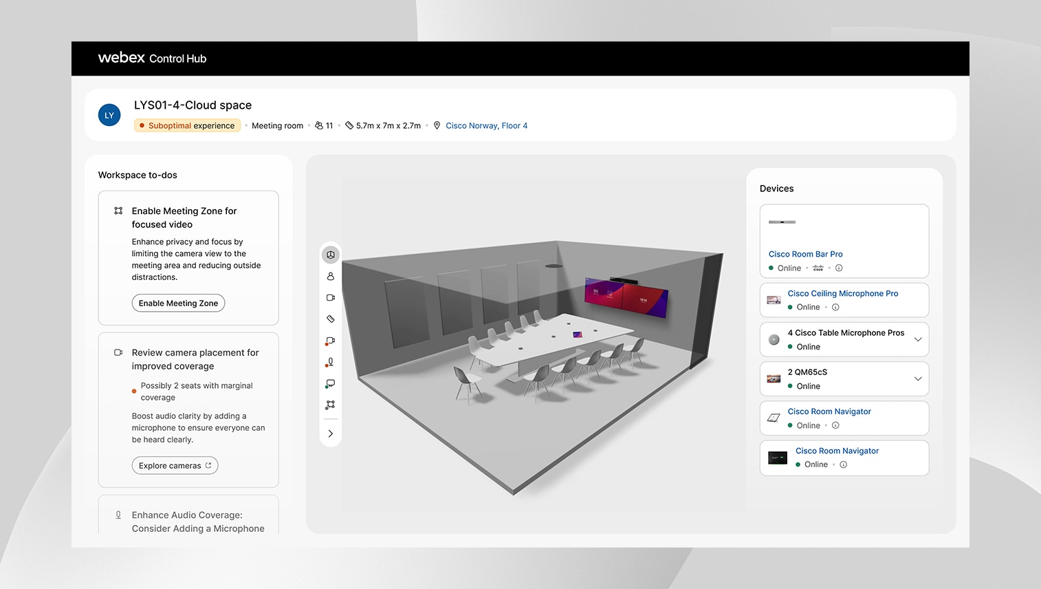シスコデバイスに組み込まれた AI を活用して、Control Hub で物理空間のデジタルレプリカを自動生成します。会議室のオーディオビジュアル カバレッジを可視化し、ベストプラクティスとガイド付きの推奨事項を活用して会議室での体験を最適化します。