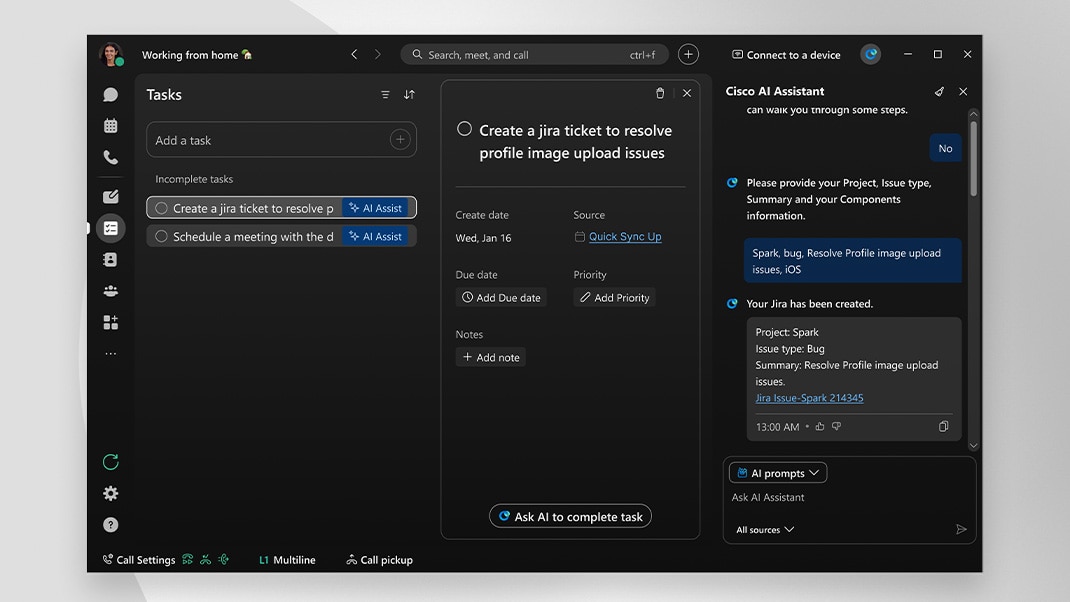 Webex を離れることなく、即座に AI Assistant パネル内で Jira チケットを作成、更新、管理できます。