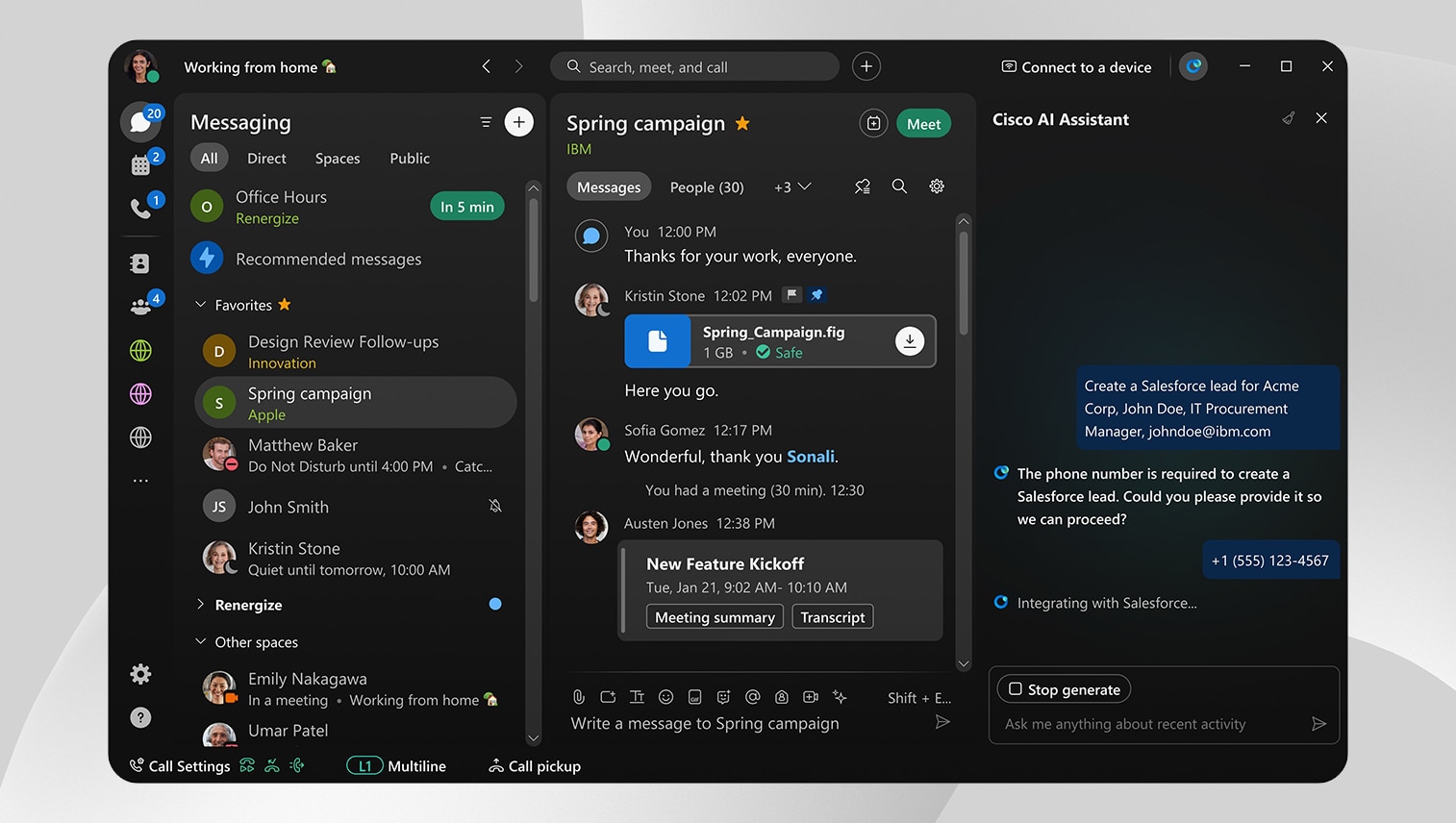 Cisco AI Assistant と Copilot の統合により、ユーザーは議論の質を高め、Webex と Copilot にまたがって検索し、即座に提供されるコンテキストと自動化を通じて意思決定を迅速化できます。