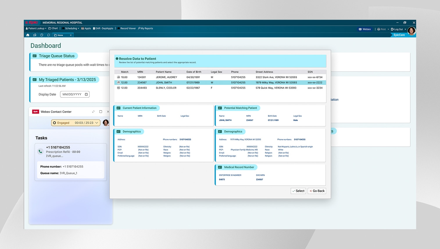 Webex Contact Center と Epic Systems の統合によって、Epic Cheers/Hyperdrive UI に機能豊富なコミュニケーション プラットフォームが追加されました。エージェントはマルチチャネルの会話を Epic 内で直接管理できるため、ウィンドウの切り替えが不要で、より簡単かつ効果的に患者対応できます。