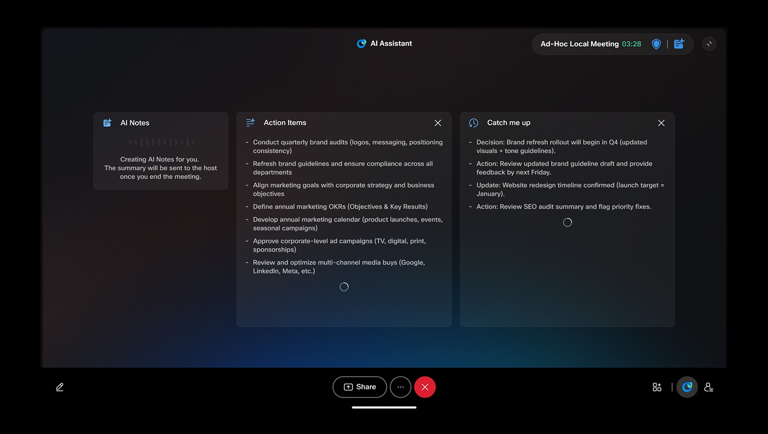 突発的な対面ハドル会議やブレインストーミングでも、Cisco AI Assistant のインテリジェントなミーティング文字起こし機能と要約機能を活用できます。