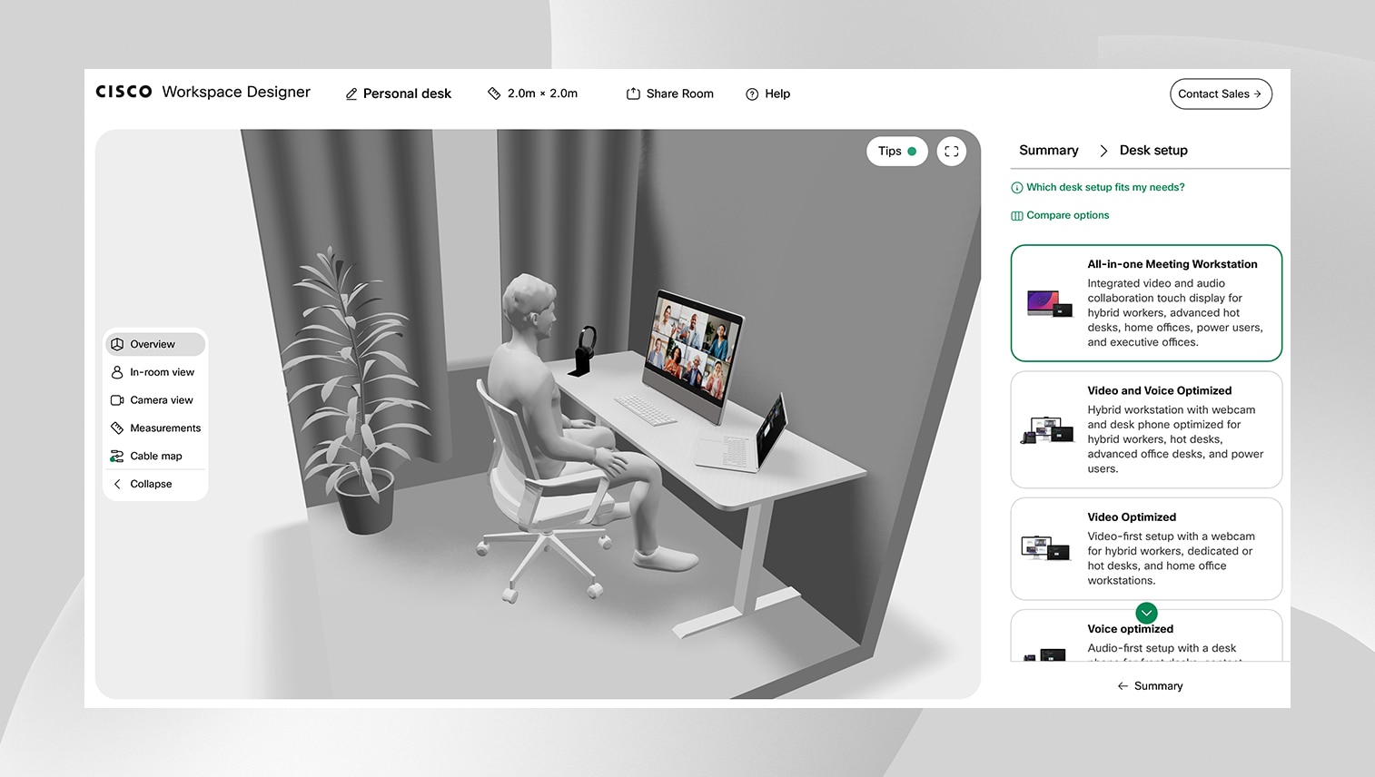 インタラクティブな 3D エクスペリエンスで、シスコの Web カメラ、ヘッドセット、デスクフォン、オールインワン デスク コラボレーション デバイスを使用したデスクワークステーション、ホットデスクスペース、フォーカスルームを大規模に計画して可視化できます。