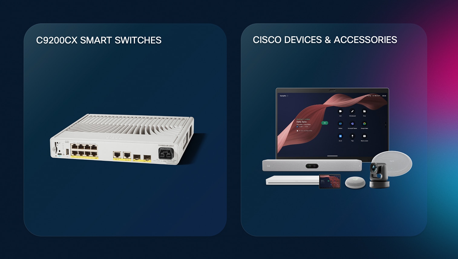シスコのコラボレーションデバイスとアクセサリに Catalyst 9200CX スマートスイッチを組み合わせることで、over Ethernet 対応のコネクテッド AV 周辺機器の範囲拡大、Control Hub でのスイッチの管理、環境のネットワーク可視化を実現できます。