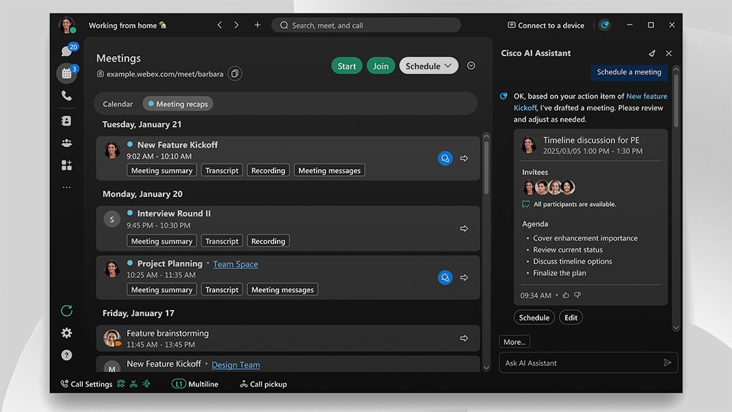 Webex Suite 向けの新しい専用 AI エージェントが登場します。Notetaker(議事録)、Task Agent(作業)、Polling Agent(投票)、Meeting Scheduler(会議日程調整ツール)、Receptionist(受付担当者)という 5 つの AI エージェントが、その場での素早い要約、リアルタイムのタスク作成、状況に応じた参画の促進、ワンクリックでのスケジューリング、各会議でのシームレスなゲスト管理を実現します。
