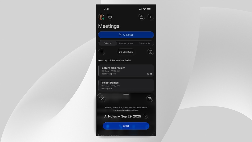 業務に関するディスカッションを文字起こしして要約します。スケジュールされていないアドホックな会議でも利用できます。[AI メモ(AI Notes)] をタップするだけで、重要なポイントとアクションアイテムをキャプチャして、ミーティングの要約とあわせて保存し、自分の受信トレイに送信できます。