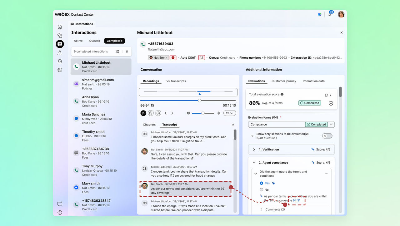Webex AI Quality Management を活用して品質保証を変革できます。モニタリング、自動評価、リアルタイムのインサイト、AI エージェントと人間のエージェントに合わせたコーチングで継続的な改善を実現します。