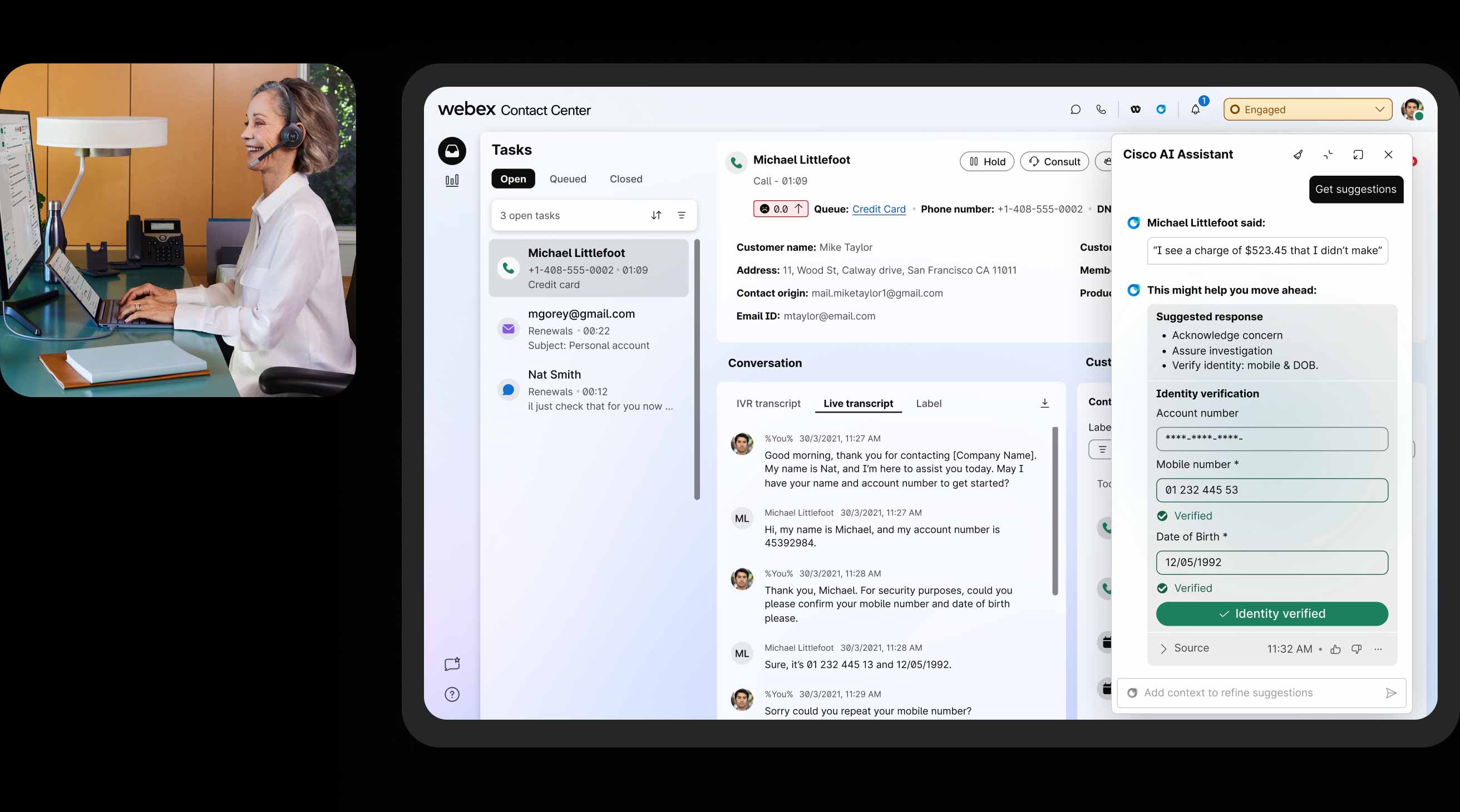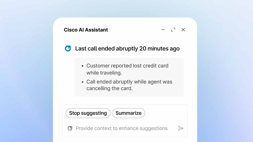 Cisco の AI プラットフォームを基盤に構築された AI Assistant for Webex Contact Center は、エージェントとスーパーバイザーにインテリジェントで自動化された支援を提供し、生産性を向上させ、リアルタイムのインサイトを生成します。
