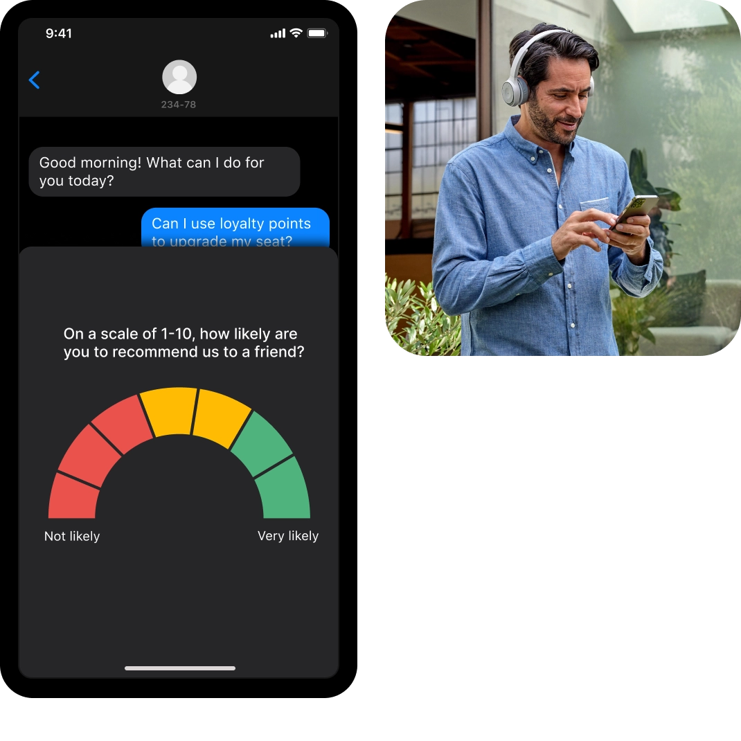デジタルでのやり取りの後に、貴重なフィードバックを収集します。顧客がすぐに記入できるよう、テキストメッセージまたは E メールで、エージェントからアンケートを送信できます。