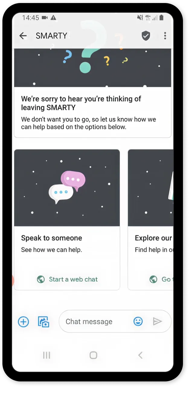 Using RCS, SMARTY sent these customers an interactive carousel feature with a number of ways to get extra support—encouraging them to stay and explore all the benefits the network has to offer.