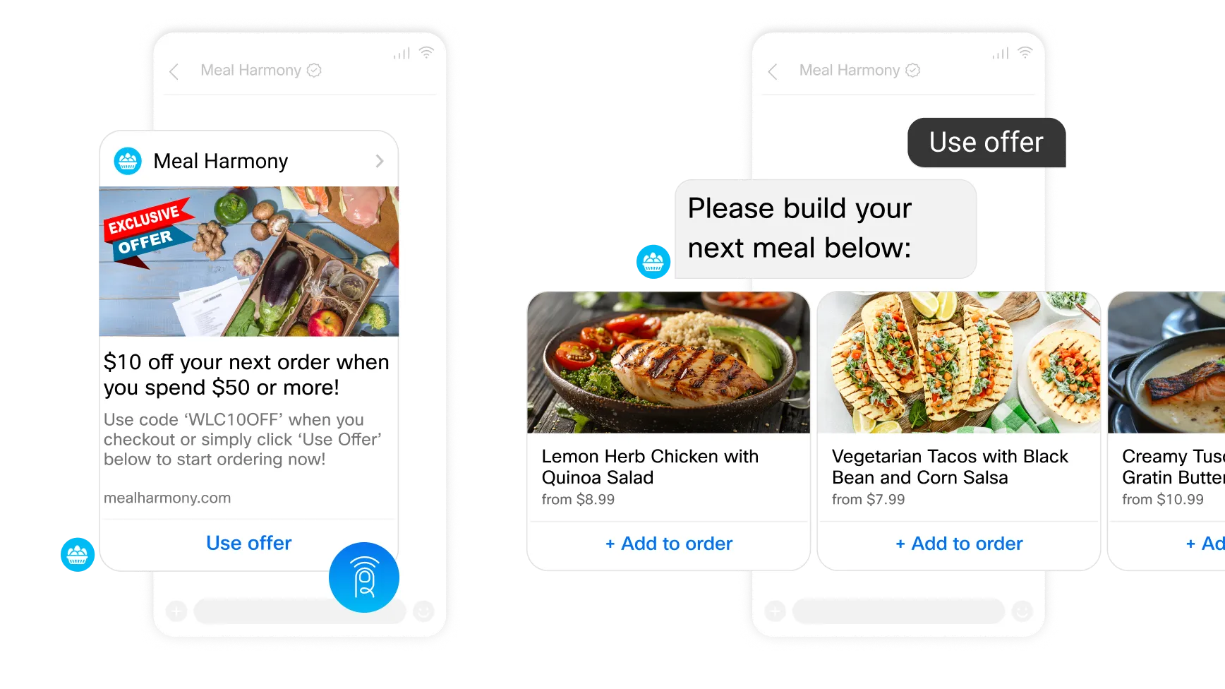Trigger automated promotions for limited time offers and enable customers to instantly redeem or save them to a digital wallet. Use rich card carousels and multimedia components to let customers view promotional content and browse goods entirely in-channel.