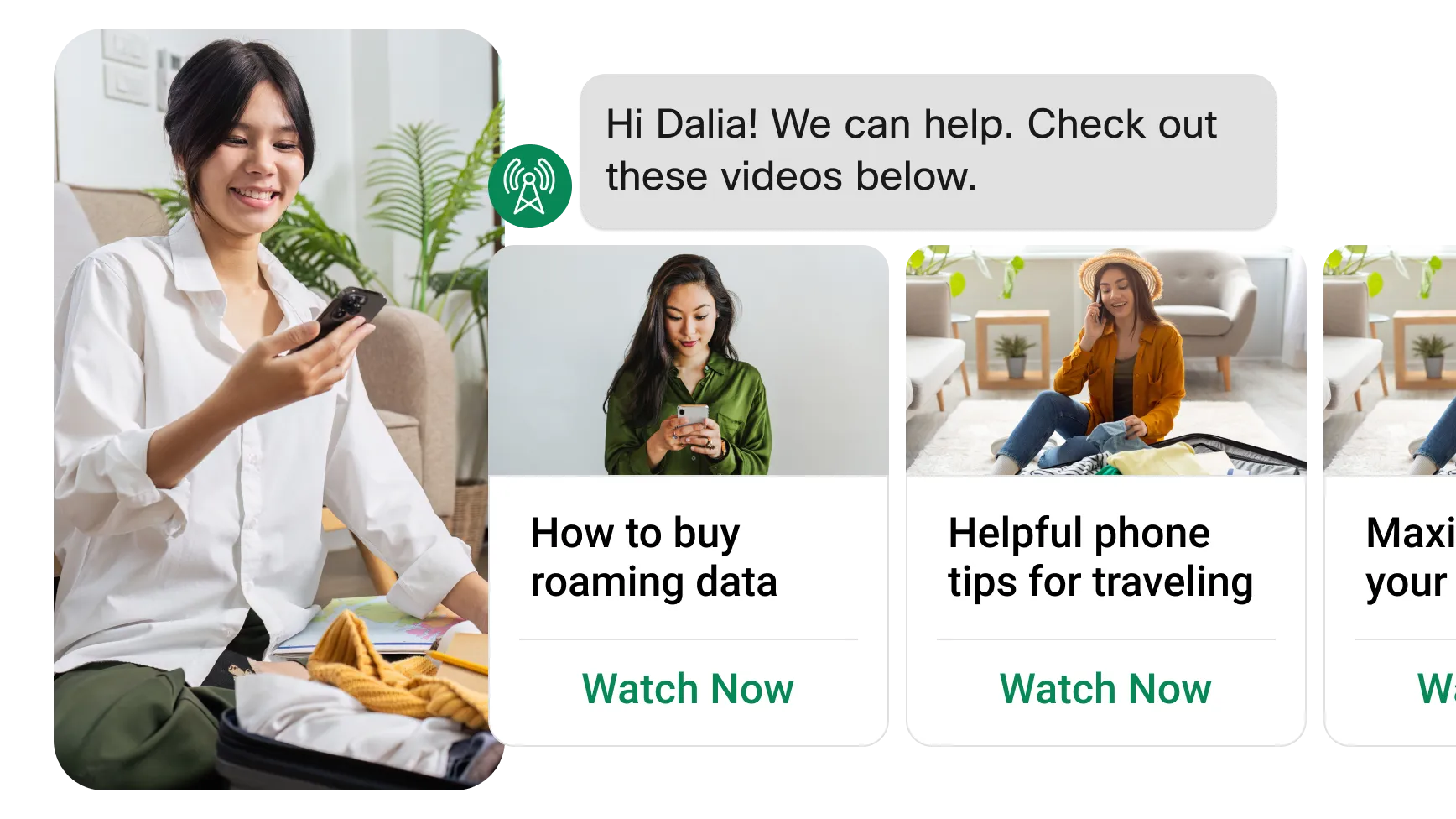 Deploy RCS chatbots so customers can troubleshoot product issues, find information like store opening times, request service updates, and manage their user profiles and loyalty programs—all without leaving the RCS chat environment.