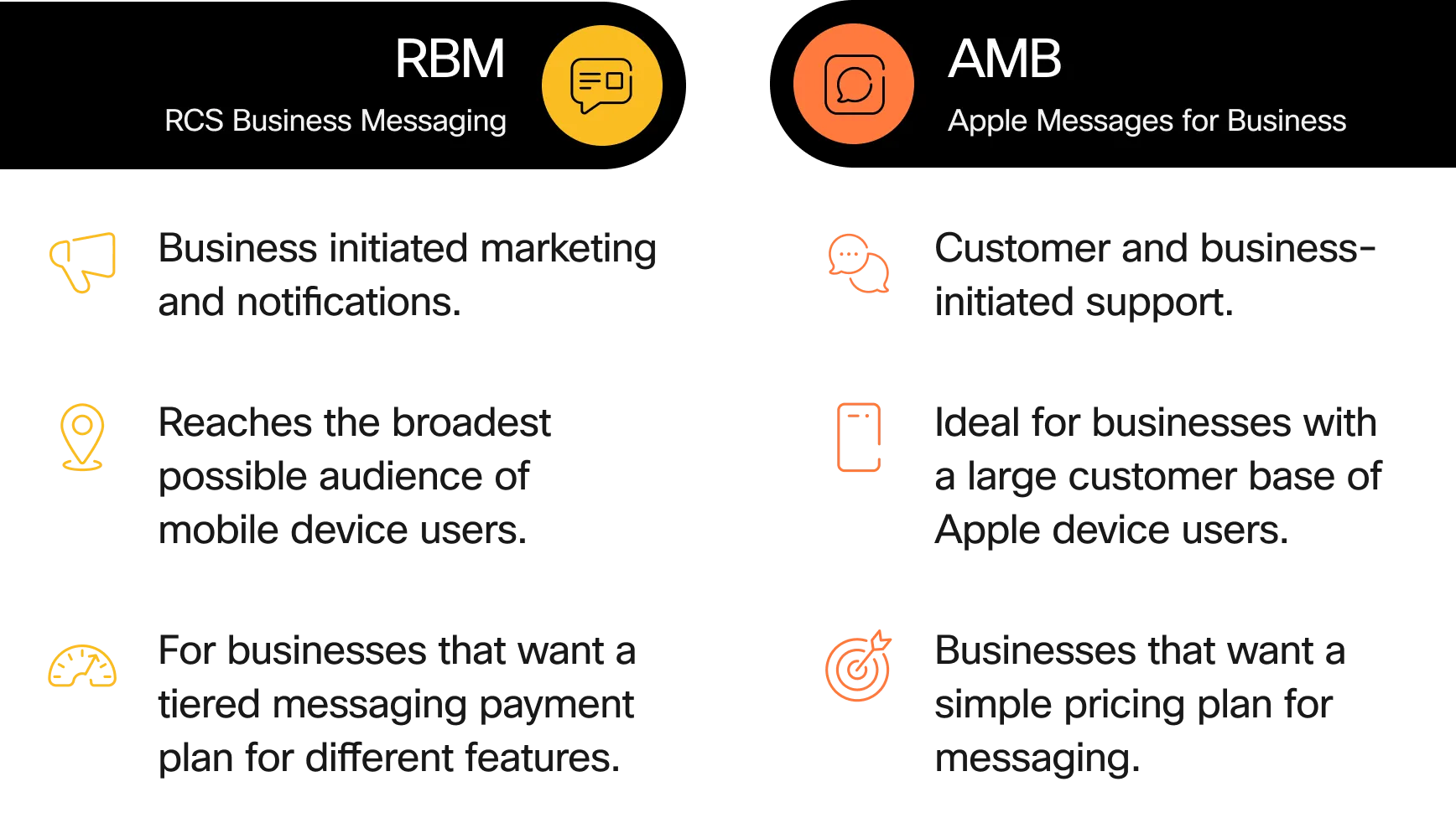 Both RBM and AMB standards support key features like rich media and verified sender marks. Beyond these features, the two have different capabilities and potential audiences, making them suited for different use cases.