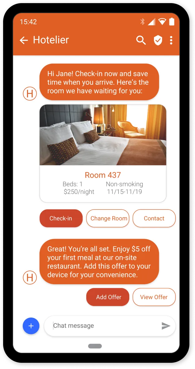 By integrating RCS messaging with your backend systems, you can build unique customer profiles that help you to more easily personalize customer journeys, in turn driving higher brand loyalty and message engagement rates. For example, you could use RCS to: