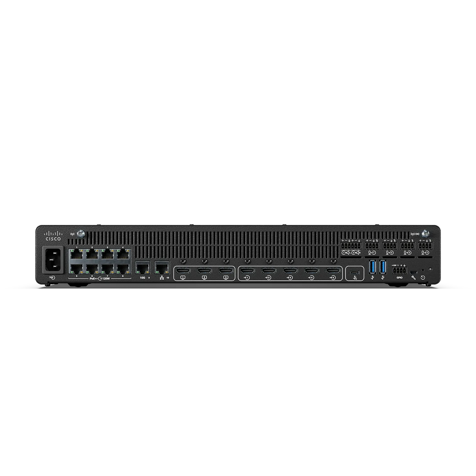 8x 1G PoE+ with 120W total budget, 1x 10G Ethernet (extensible with switch). AVoIP capacity |
