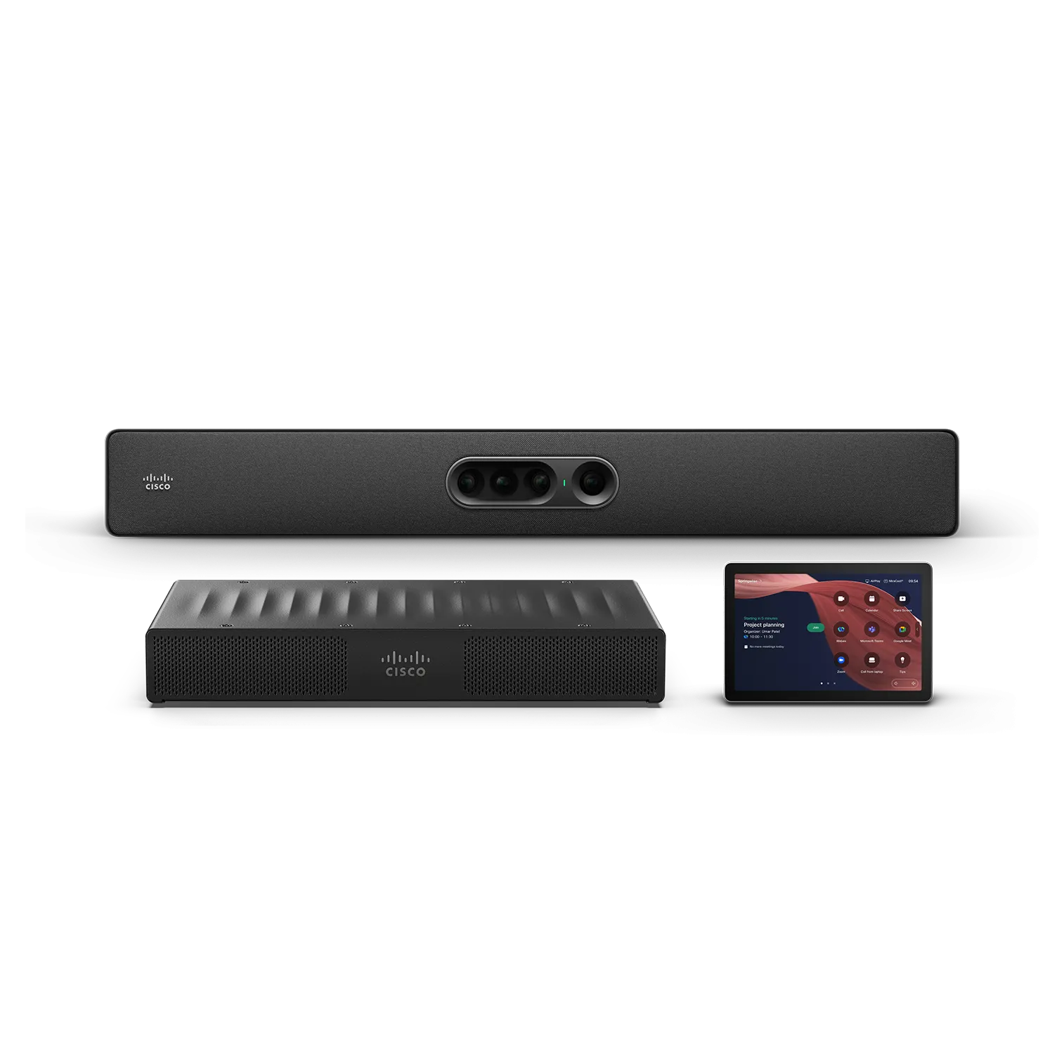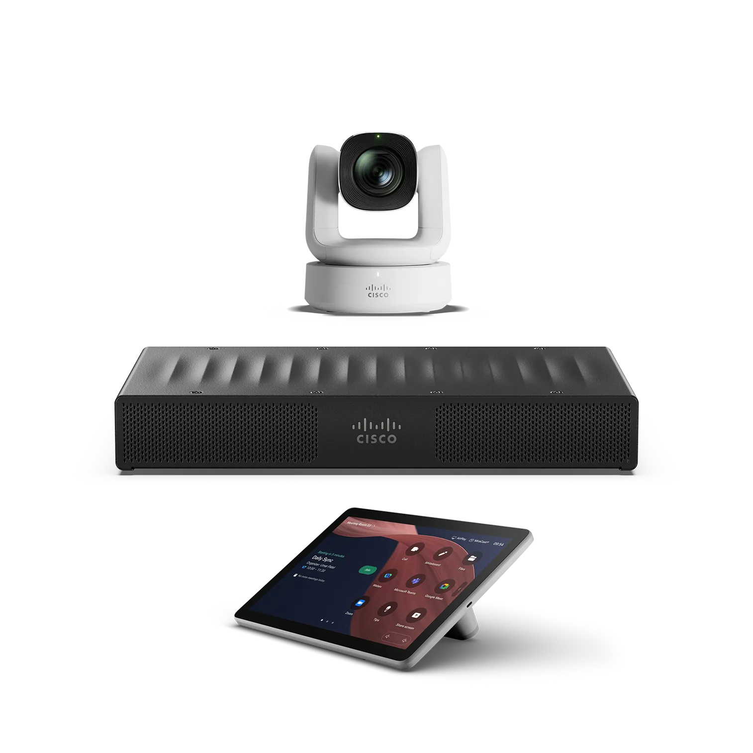 Modular room kit appliance with a standalone conferencing camera, room codec, and touch controller. Form factor |
