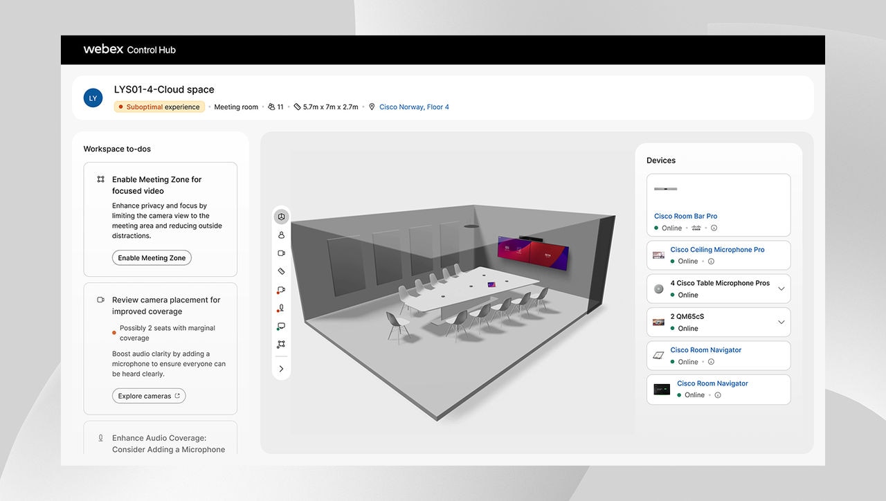 Automatically generate a digital replica of your physical spaces in Control Hub leveraging the built-in AI in Cisco devices. Visualize audiovisual coverage in your rooms and leverage best practices and guided recommendations to optimize the room experience.