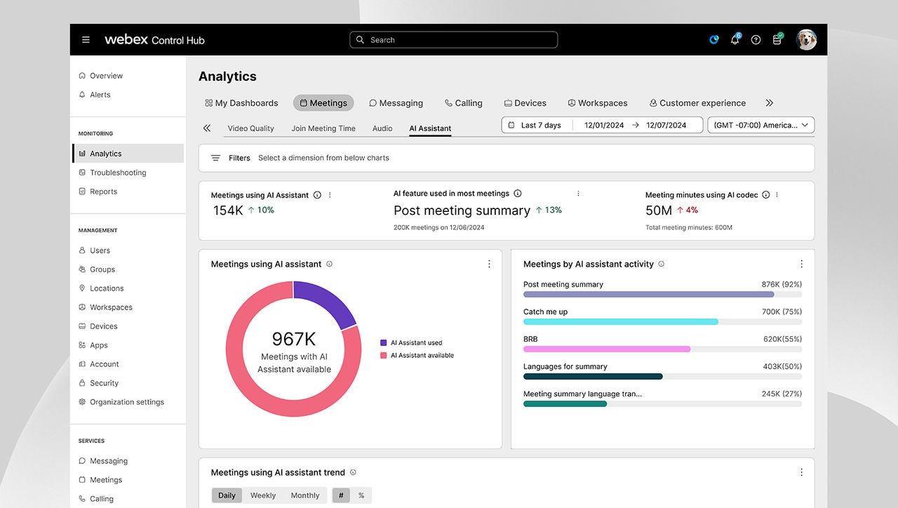 Give IT teams powerful, intuitive insights—Cisco AI Canvas in Control Hub delivers rich analytics and clear data stories to optimize collaboration experiences effortlessly.
