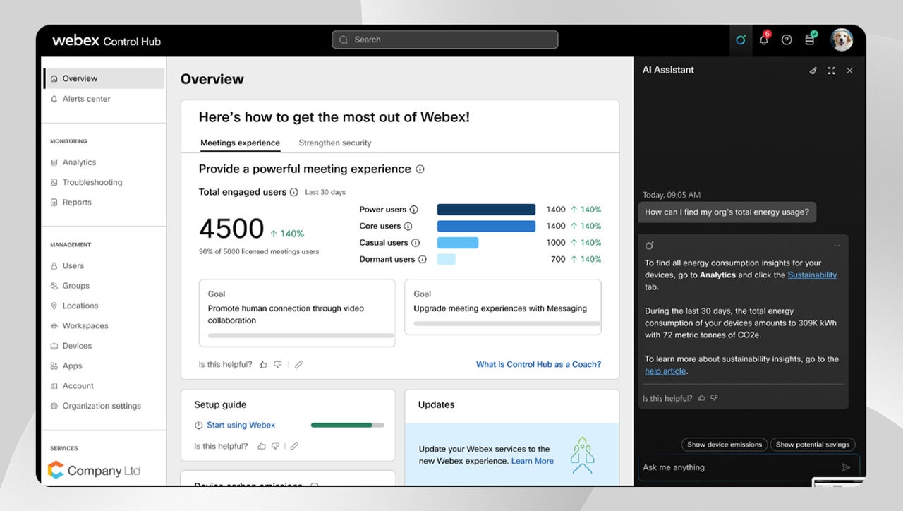 Get the most out of Webex with AI Assistant for Control Hub. Increase IT productivity with quick answers to “how do I...?” and make lightning-fast configuration changes by simply asking “Help me do...”