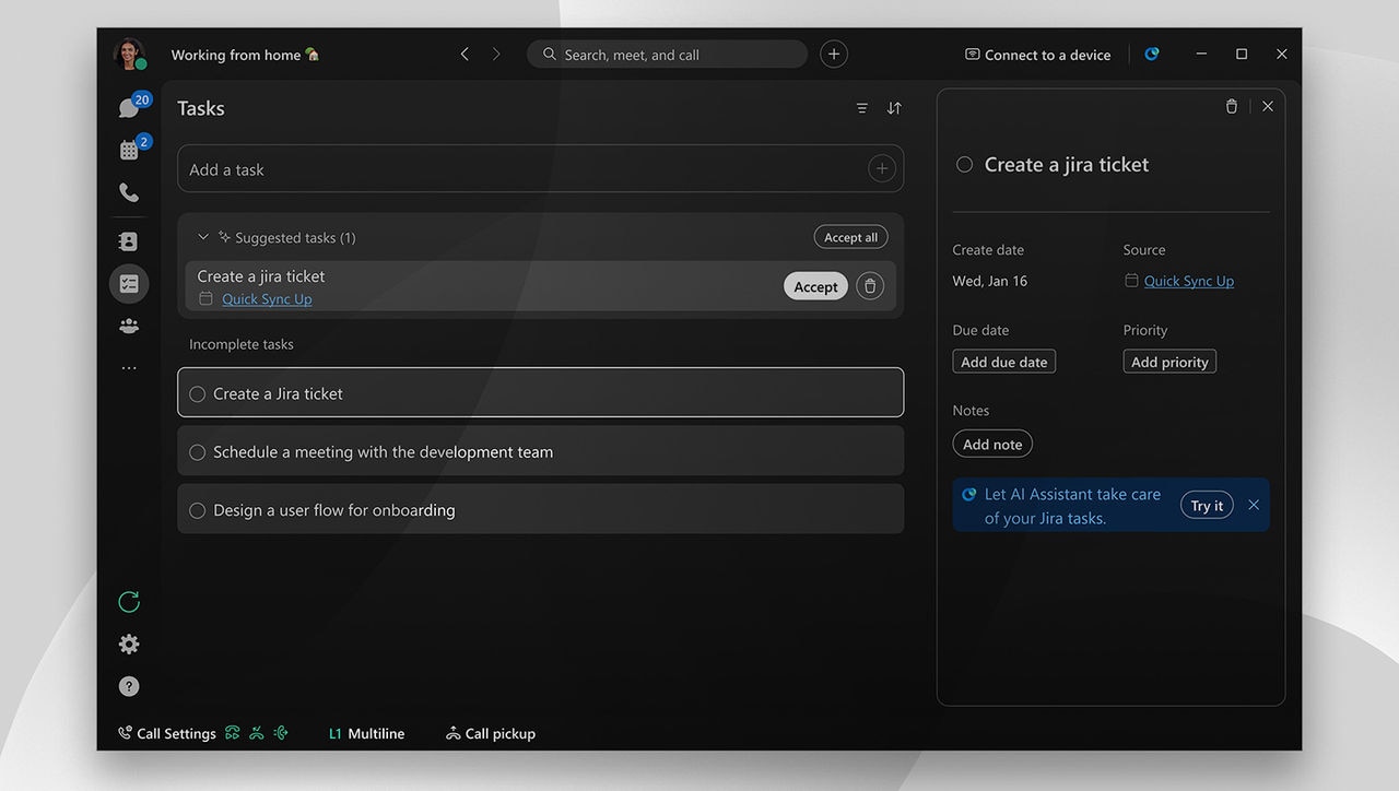 Task Agent automatically adds action items from post meeting summaries in the new “Task” tab and provides options to complete tasks such as scheduling a follow up meeting, updating Jira or Salesforce, and more.