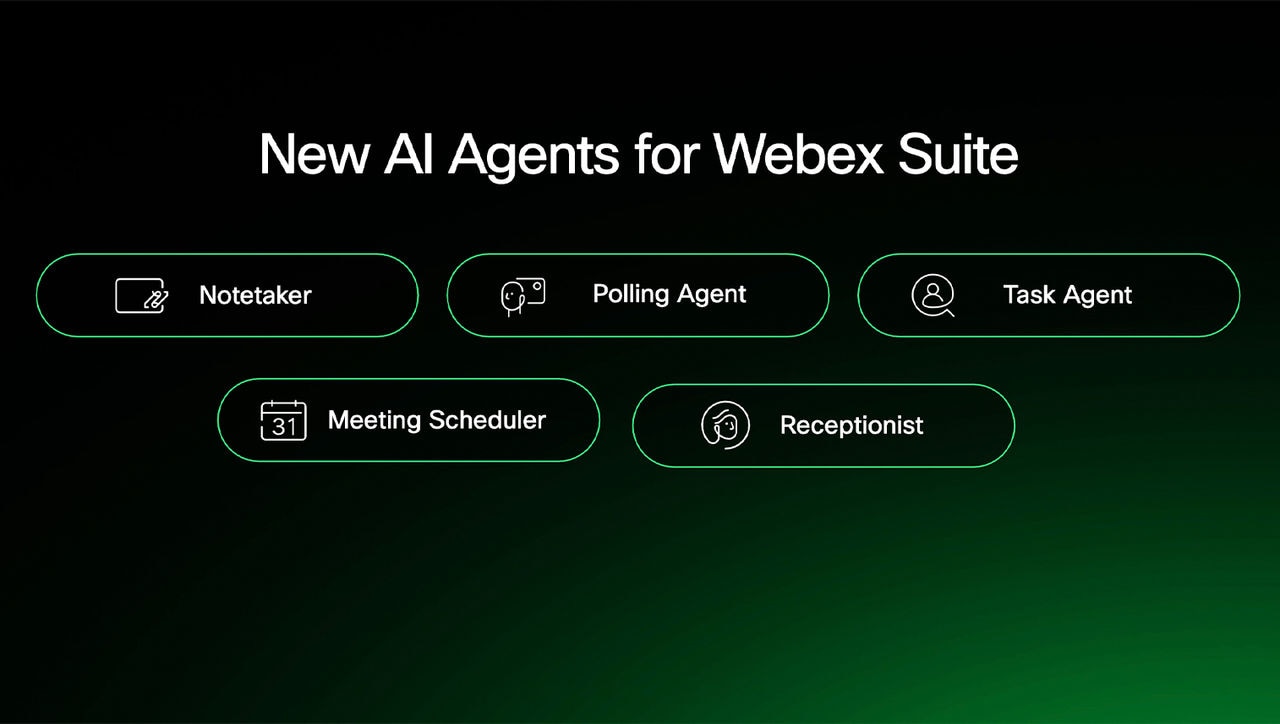 Introducing new specialized AI Agents for Webex Suite—Notetaker, Task Agent, Polling Agent, Meeting Scheduler, and Receptionist—delivering instant summaries, real-time task creation, dynamic engagement, one-click scheduling, and seamless guest management for every meeting.